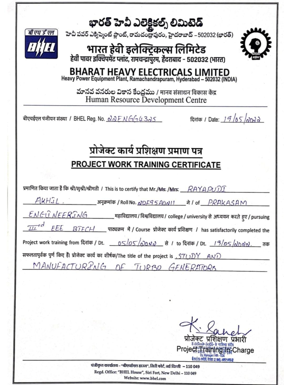 | 20F95A0211 | R. AKHIL | STUDY AND MANUFACTURE OF TURBO GENERATOR | 2022 | BHEL |