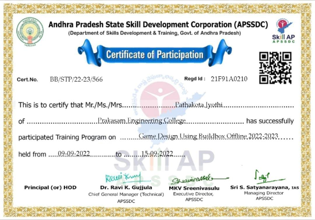 | 21F91A0210 | PATHAKOTA JYOTHI | GAME DESIGNING USING BUILD BOX OFFLINE | 2022 | ANDHRA PRADESH STATE SKILL DEVELOPMENT CORPORATION |